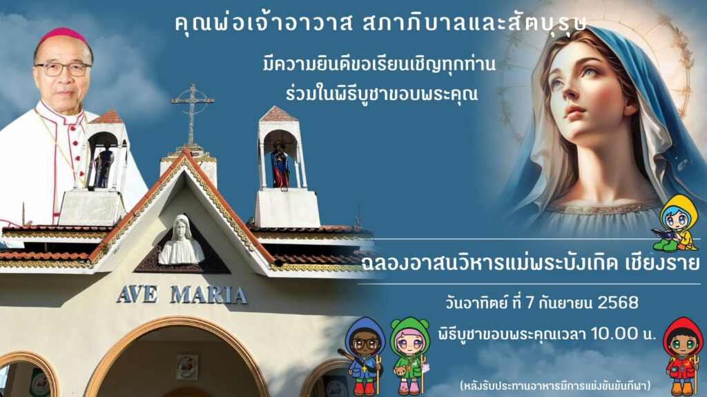 +++ คุณพ่อเจ้าอาวาส สภาภิบาล และสัตบุรุษ มีความยินดีขอเรียนเชิญทุกท่านร่วมในพิธีบูชาขอบพระคุณฉลองอาสนวิหารแม่พระบังเกิด เชียงราย ในวันอาทิตย์ที่ 7 กันยายน 2568 เวลา 10.00 น. โดยพระสังฆราช ยอแซฟ วุฒิเลิศ แห่ล้อม ประธานในพิธี —————— ในโอกาสนี้หลังการรับประทานอาหารกลางวัน จะมีการจัดการแข่งขันกีฬาสัมพันธ์ กระชับมิตร ⚽️โดยมีการแข่งขันฟุตซอลและวอลเลย์บอล สามารถส่งตัวแทนจากเขตวัดต่างๆได้เขตวัดละ 1 ทีม🏐 🩷เพื่อสร้างความสัมพันธ์อันแน่นแฟ้นต่อกัน🩷
